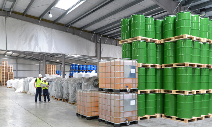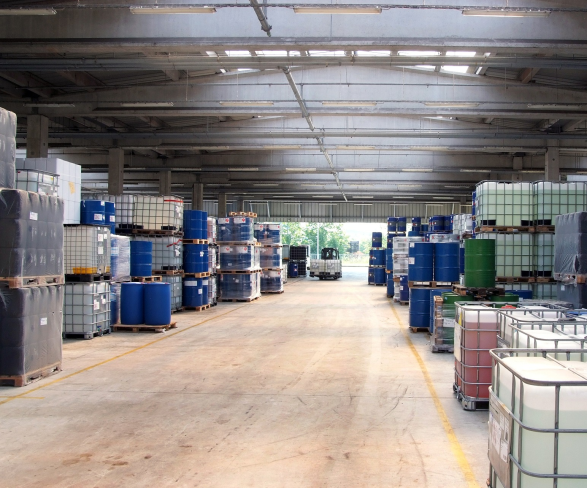 The storage of environmentally hazardous goods takes place in our chemical warehouse . This warehouse consists of six separate compartments. These separate compartments make it possible to store hazardous substances from various hazard classes in one warehouse.